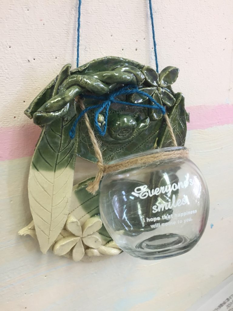 今年の陶芸作品、花瓶ぶら下げれる オブジェです。🌺🌼スッテキ!わたしも、作ればよかったです。お皿は、お母さんたちの作品です。💛 -
